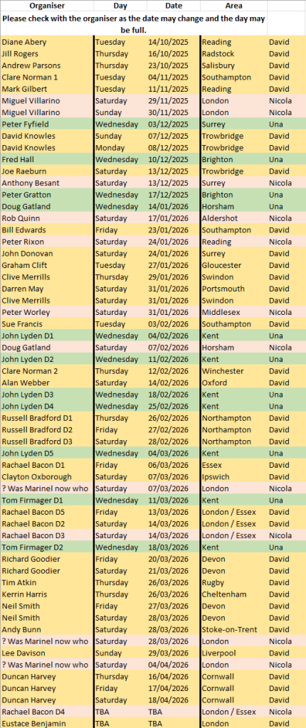 The table below shows the proposed dates and the organiser for a given area. It is the fanciers job to check with the organiser that they are on the list for the coming season.
